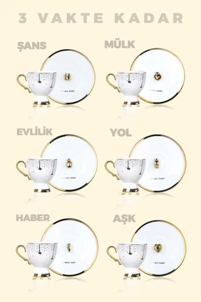 6 adet birbirinden farklı (şans, yol, evlilik, aşk, mülk ve haber) fincan tabağı