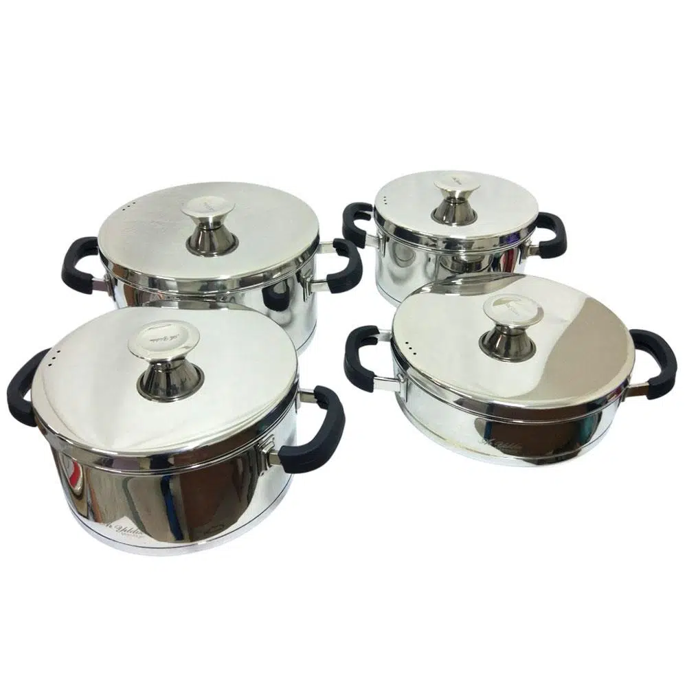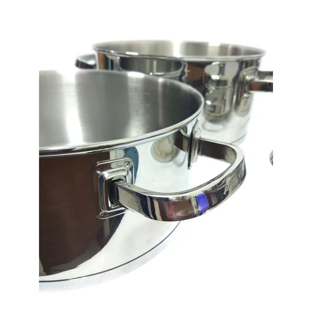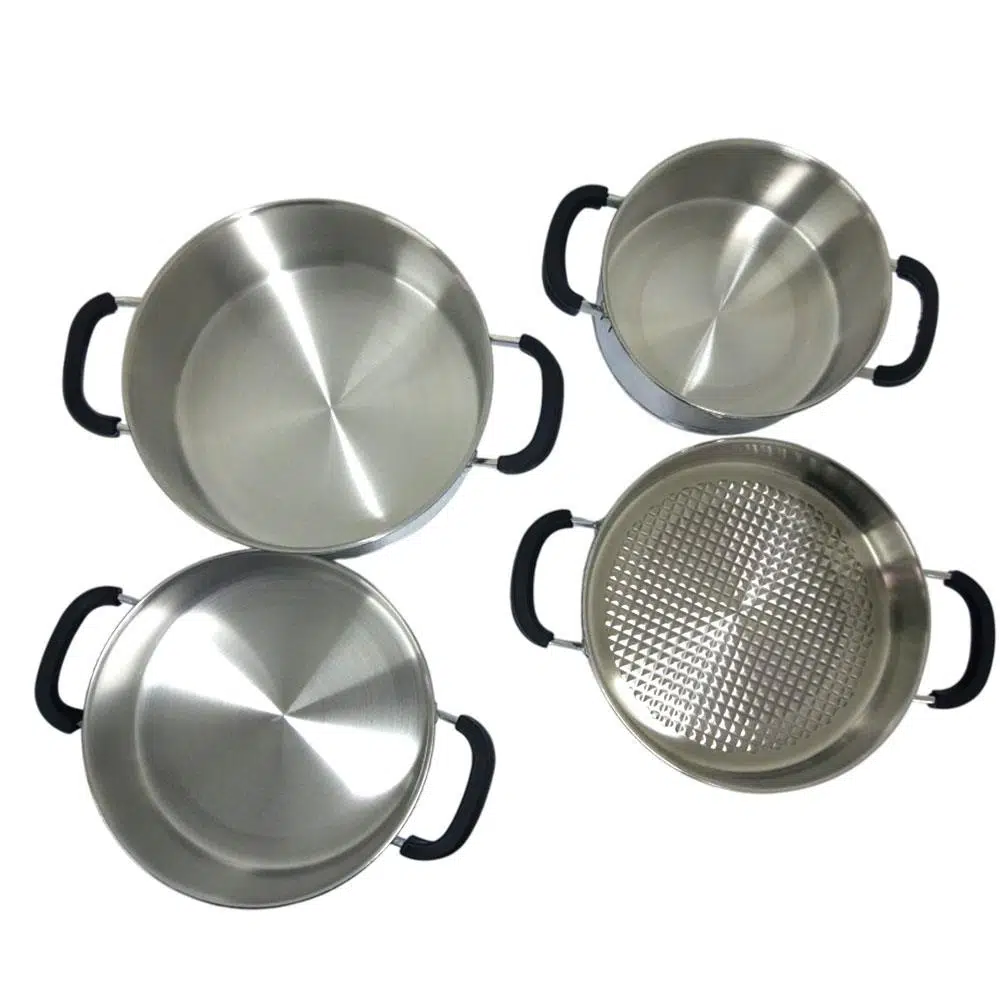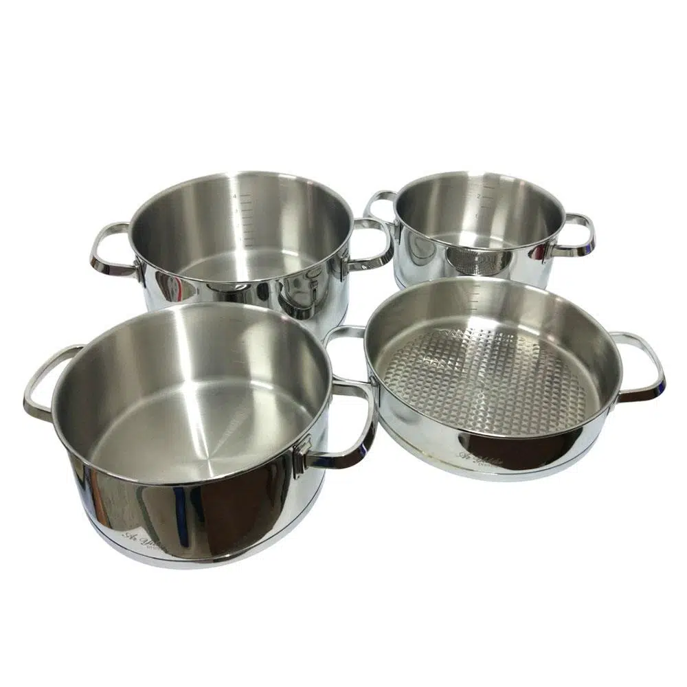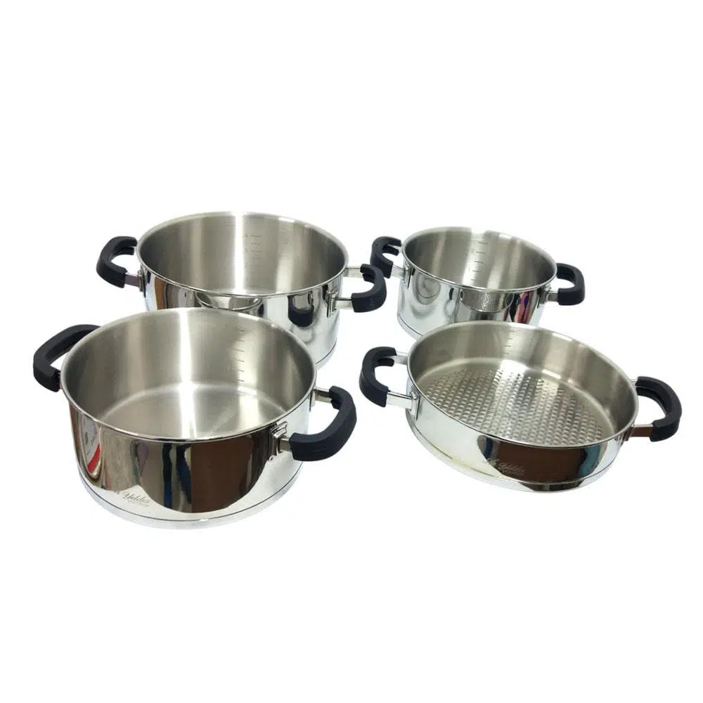 Ürün Ölçüleri • 24x12 cm tencere 5,2 litre • 22x10 cm tencere 3,5 litre • 20x10 cm tencere 3,0 litre • 24x6 cm tencere 2,5 litre Ürün Özellikleri • 304 kalite 18/10 paslanmaz çelikten imal edilmiştir. • Çelik kapaktır. • Silikon Tutacak 8 Adet |