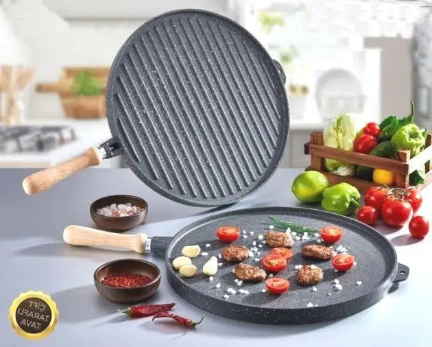 Çift Taraflı Tasarım: Eda Çift Taraflı Yuvarlak Tava, 36 cm genişliği ile geniş pişirme alanı sunar. Bir tarafı düz yüzey (kızartma için) ve diğer tarafı ise ızgara (grill) yüzeyine sahip olup, her iki tarafı da farklı yemek pişirme ihtiyaçlarınızı karşılayacak şekilde tasarlanmıştır. Bu tasarım, yemeklerinizi daha pratik bir şekilde hazırlamanıza olanak tanır.