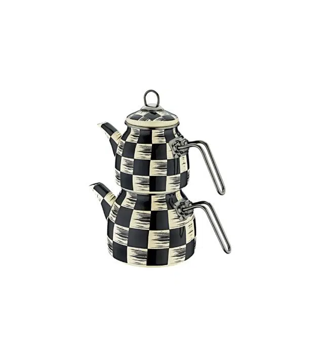Burak Emaye Çaydanlık Siyah Beyaz Damalı Siyah Kulplu