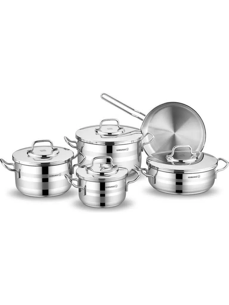 - 9 parça set— farklı boyutlardaki tencereler ve tava ile çok yönlü kullanım.