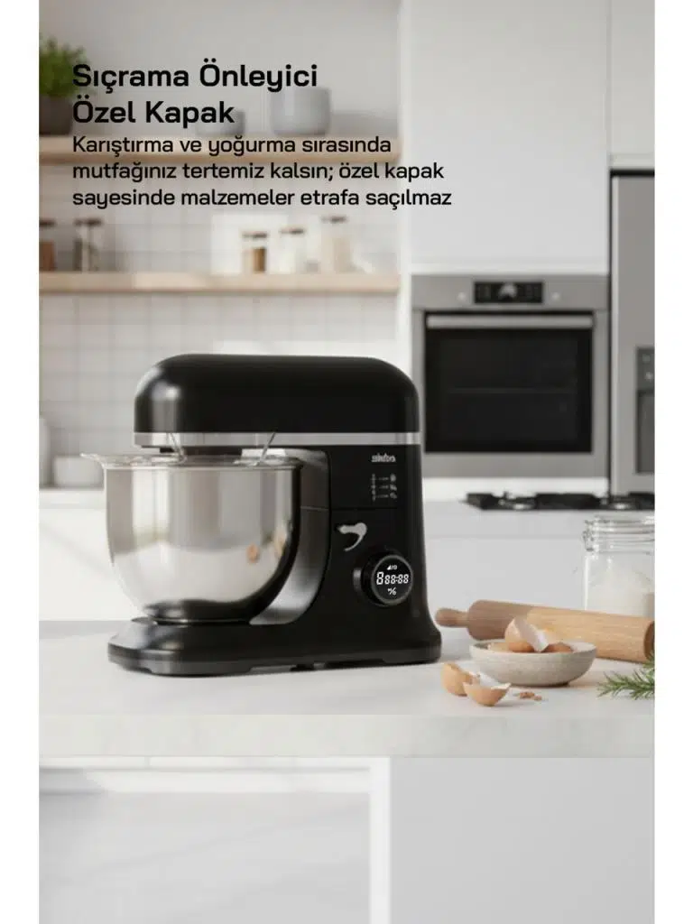SMX-2773 7.5 L / 1500W Dijital Ekranlı Zaman Ayarlı Stand Mikser, güçlü 1500W motoru ile yoğun karışımlar ve sert hamurlarda bile yüksek sunar. Dijital ekranlı kontrol paneli sayesinde hız ve süre ayarlarını hassas şekilde yönetebilir, zaman ayarlı çalışma fonksiyonuyla kontrollü ve pratik bir kullanım deneyimi elde edebilirsiniz. 7,5 litrelik geniş paslanmaz çelik haznesi kalabalık aileler ve büyük porsiyonlar için idealdir. Üç farklı aparat ile çırpma, yoğurma ve karıştırma işlemlerini tek cihazda toplar. Şeffaf kapak sıçramayı önlerken, güvenlik kilidi ve kaymaz ayaklar stabil ve güvenli kullanım sağlar. Dayanıklı yapısı ile mutfakta uzun süre vazgeçilmez bir yardımcı olur.